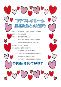 お知らせ 2026年1月21日 rokugo プチ☆プレイルーム「園長先生と遊ぼう」 申込み方法:定員は25名です。 ※先着順となります。 参加される方は2月18日(水)までに 電話で「プチプレイルーム園長先生と遊ぼうの申し込み」とお伝えください。 ※アレルギーのある方はお伝えください。